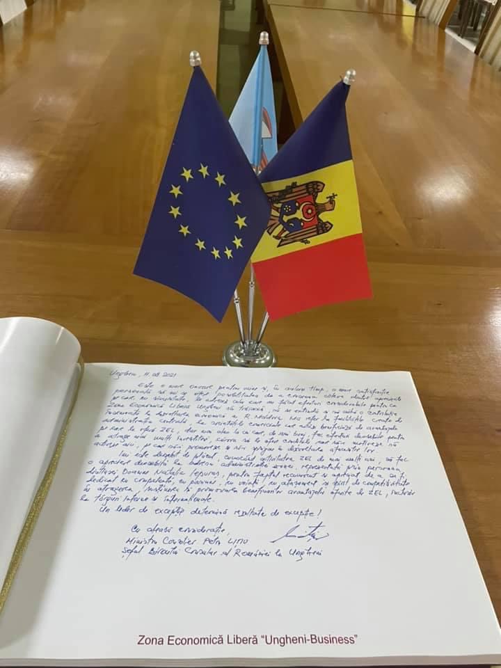 Ieri, 11.08.2021, am fost onorați cu prezența Domnului Ministru Consilier, Petru Lițiu, Șeful Biroului Consular al României la Ungheni, lăsîndu-ne un mesaj valoros în Cartea de Onoare a Zonei Economice Libere Ungheni-Business, mesaj cu un profund respect, care ne-a pus în valoare activitatea noastră, îndemnîndu-ne la un efort și mai mare pentru dezvoltarea ZEL!